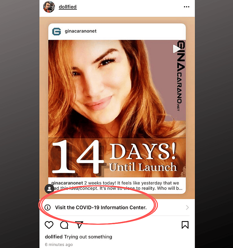 According to a screenshot, Instagram had placed a COVID-19 related warning on a story post made by @thattugglife which featured a completely unrelated promotion for the upcoming website launch of, essentially a Carano fansite, GinaCaranoNet.