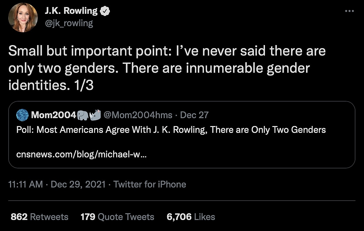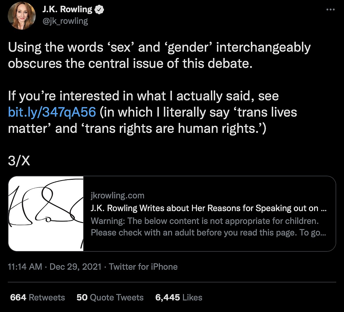 RELATED: J.K. Rowling Clarifies “I Never Said There Are Only Two Genders,” Says Real Question Is ‘Whether Sex Or Gender Identity Should Form The Basis Of Decisions On Women’s Rights And Protections’