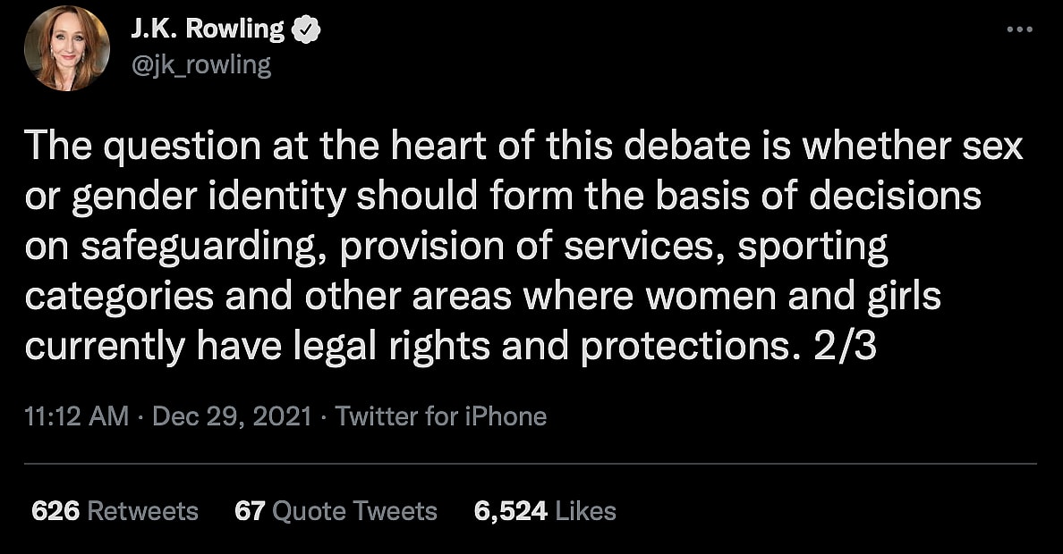 Elaborating even further, the Harry Potter creator asserted, “The question at the heart of this debate is whether sex or gender identity should form the basis of decisions on safeguarding, provision of services, sporting categories and other areas where women and girls currently have legal rights and protections.”