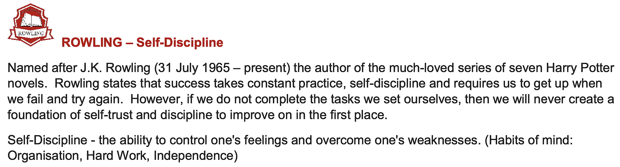 As per the description provided by the school, “Rowling states that success takes constant practice, self-discipline and requires us to get up when we fail and try again. However, if we do not complete the tasks we set ourselves, then we will never create a foundation of self-trust and discipline to improve on in the first place.”