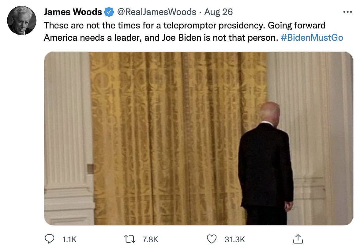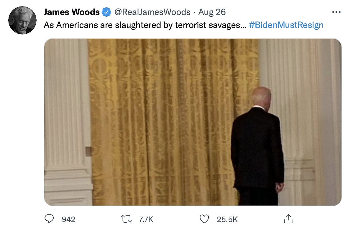 James Woods retweeted an article published by Fox News, where it was revealed that several GOP congressmen and congressional candidates were calling for either the resignation or impeachment of Joe Biden after the attacks near Hamid Karzai International Airport in Kabul, Afghanistan.