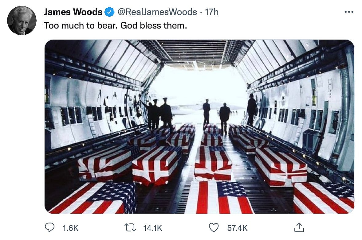 Expressing his condolences for the U.S Navy and U.S. Army soldiers, and the 11 Marine Corps members that died in the line of duty, James Woods tweeted a commemorative image and wrote, “Too much to bear. God bless them.”