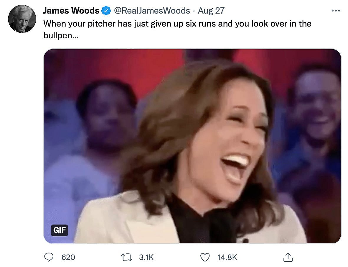 The actor tweeted, “When your pitcher has just given up six runs and you look over in the bullpen…” The tweet was accompanied by an animated gif of the Vice President’s now-notorious cackle.
