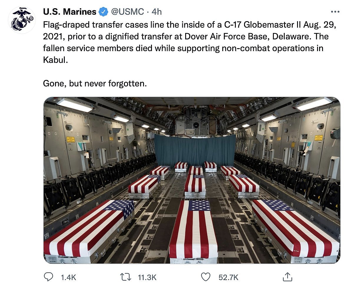 The U.S. Marines Twitter account shared the official image this Sunday afternoon, writing, “Flag-draped transfer cases line the inside of a C-17 Globemaster II Aug. 29, 2021, prior to a dignified transfer at Dover Air Force Base, Delaware.”