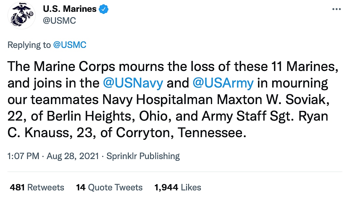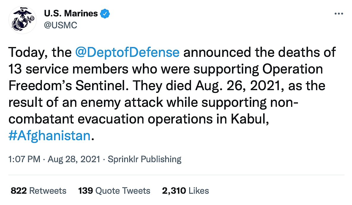 The official U.S. Marines Twitter account confirmed, via the Department of Defense, 13 service members were killed whilst supporting Operation Freedom’s Sentinel. “They died Aug. 26, 2021, as the result of an enemy attack while supporting non-combatant evacuation operations in Kabul, #Afghanistan.”