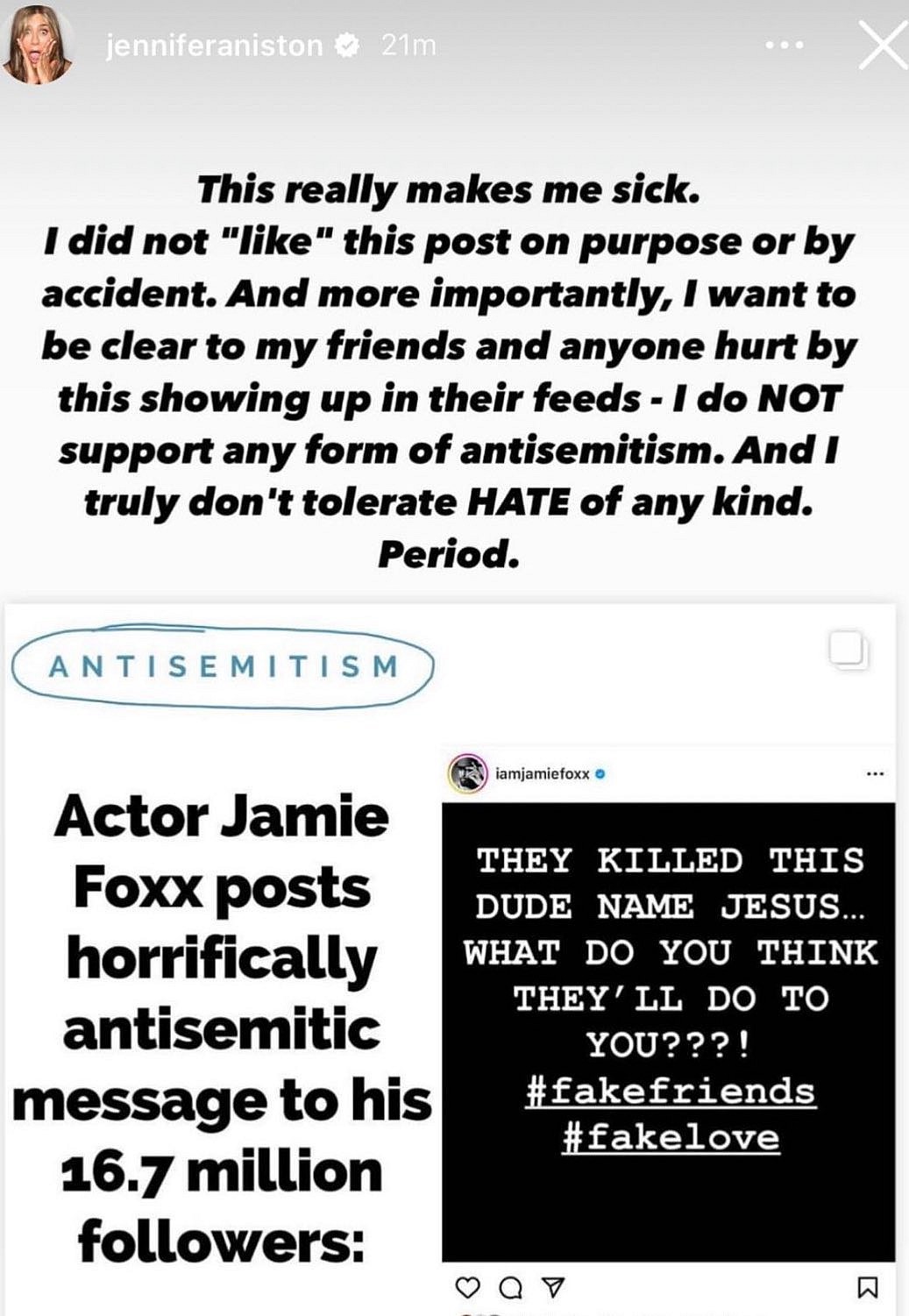 Aniston, who liked Foxx’s initial post, issued a statement condemning what he said after word got out that it upset the Jewish community.
