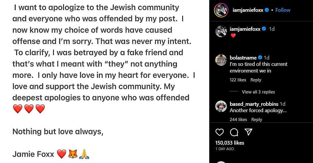 The situation with Jamie Foxx has caused tension within the Black and Jewish communities, many in the Black community feel Foxx’s apology was unwarranted as the post was not directed at Jews at all while others says otherwise.