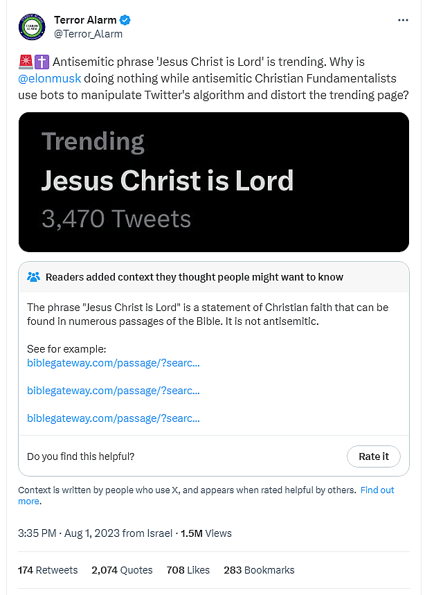 Terror_Alarm, who claims “most of the tweets on our Twitter feed are AI-generated,” wrote on Twitter at the beginning of this month, “Antisemitic phrase ‘Jesus Christ is Lord’ is trending. Why is Elon Musk doing nothing while antisemitic Christian fundamentalists use bots to manipulate Twitter’s algorithm and distort the trending page?”
