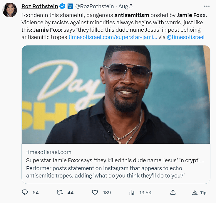 Roz Rothstein, the CEO and co-founder of Stand With Us, tweeted, “I condemn this shameful, dangerous antisemitism posted by Jamie Foxx. Violence by racists against minorities always begins with words, just like this: Jamie Foxx says ‘they killed this dude name Jesus’ in post echoing antisemitic tropes.”