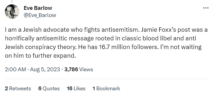 Journalist Eve Barlow tweeted, “I am a Jewish advocate who fights antisemitism. Jamie Foxx’s post was a horrifically antisemitic message rooted in classic blood libel and anti Jewish conspiracy theory. He has 16.7 million followers. I’m not waiting on him to further expand.”