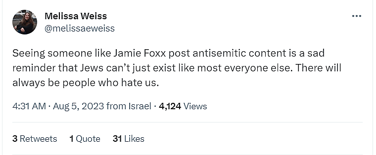Melissa Weiss, Executive Editor at Jewish Insider, wrote, “Seeing someone like Jamie Foxx post antisemitic content is a sad reminder that Jews can’t just exist like most everyone else. There will always be people who hate us.”
