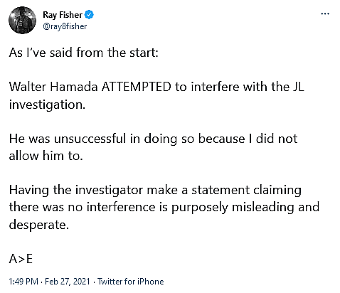Fisher, who has vocally alleged abuse from crew and enabling by producers during his experience on the set of Justice League, has now accused Hamada of destroying his credibility and deligitimizing the investigation into his claims.