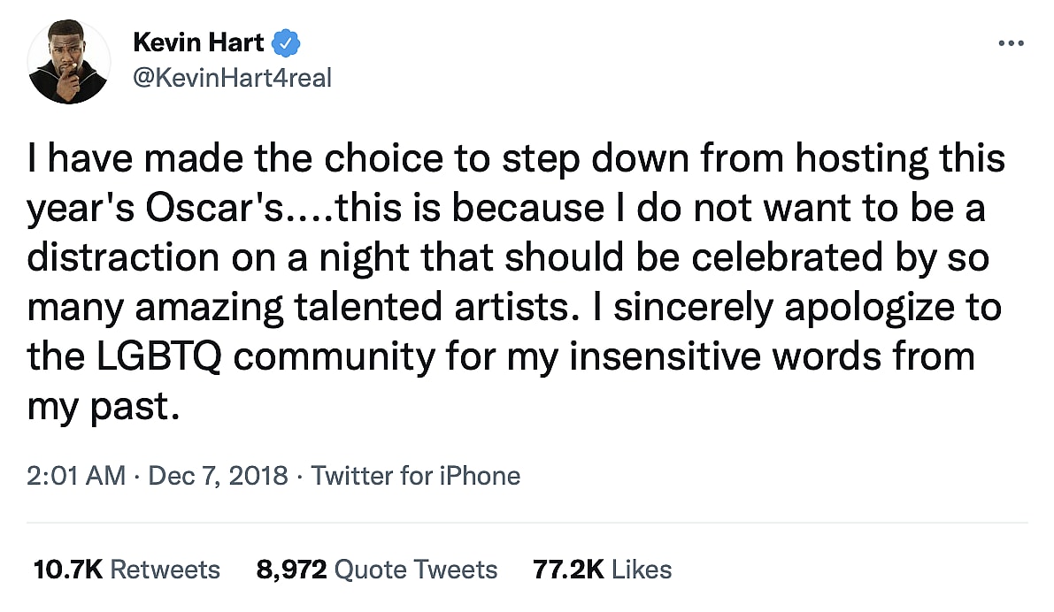 “I have made the choice to step down from hosting this year’s Oscar’s….this is because I do not want to be a distraction on a night that should be celebrated by so many amazing talented artists,” wrote the comedian at the time. “I sincerely apologize to the LGBTQ community for my insensitive words from my past.”
