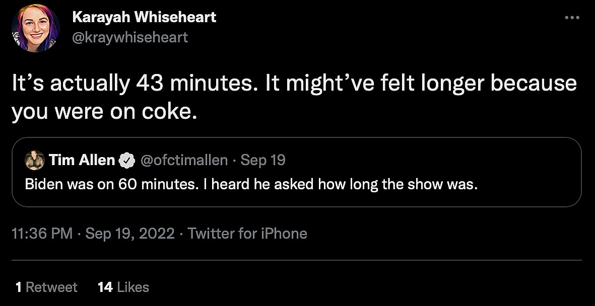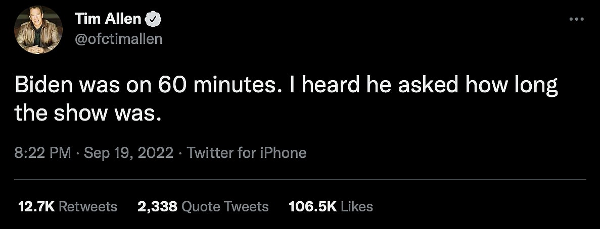 “Biden was on 60 minutes. I heard he asked how long the show was,” read the entirety of Allen’s cheeky tweet regarding the US President’s seemingly apparent cognitive decline.
