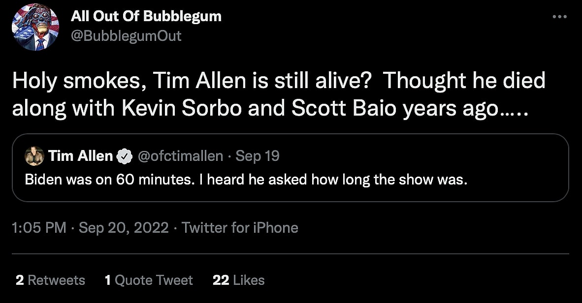 Dropping yet another unoriginal comment, @BubblegumOut parroted, “Holy smokes, Tim Allen is still alive? Thought he died along with Kevin Sorbo and Scott Baio years ago…”