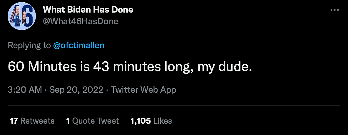 In another poor attempt at getting one over on Allen, @What46HasDone decried, “60 Minutes is 43 minutes long, my dude.”