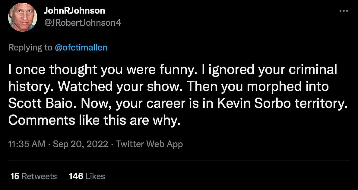 Throwing conservative actors Scott Baio and Kevin Sorbo into the mix, @JRobertJohnson4 sobbed, “I once thought you were funny. I ignored your criminal history. Watched your show. Then you morphed into Scott Baio. Now, your career is in Kevin Sorbo territory. Comments like this are why.”
