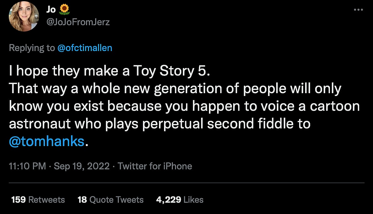 “I hope they make a Toy Story 5,” notorious Democratic party supporter @JoJoFromJerz began her nonsensical point. “That way a whole new generation of people will only know you exist because you happen to voice a cartoon astronaut who plays a perpetual second fiddle to [Tom Hanks].”