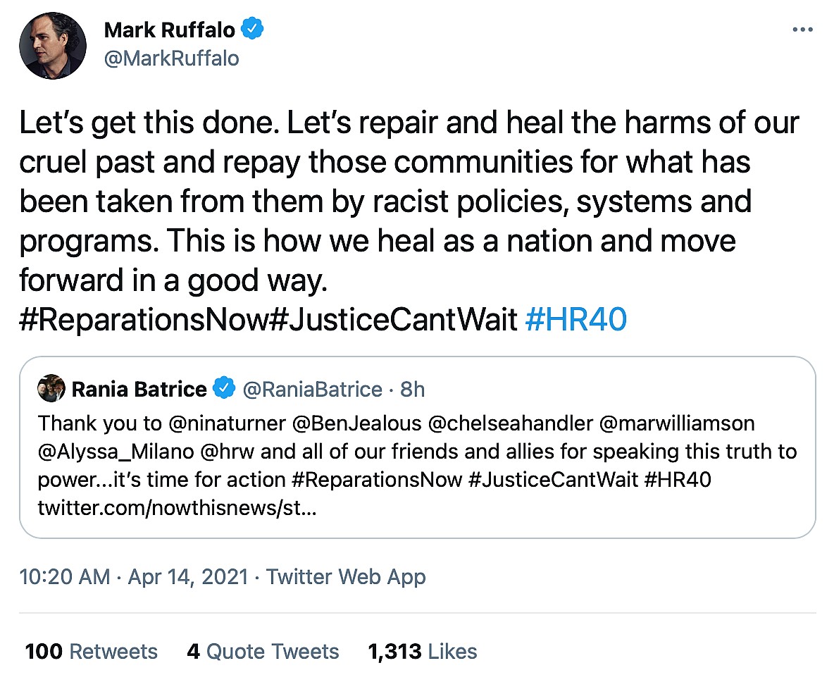 The Hulk actor adds, “Let’s repair and heal the harms of our cruel past and repay those communities for what has been taken from them by racist policies, systems and programs. This is how we heal as a nation and move forward in a good way,” reads Ruffalo’s tweet in support for reparations, while also adding the #ReparationsNow#JusticeCantWait, and #HR40 hashtags.