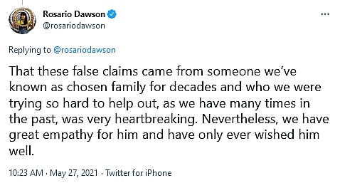 In a follow-up tweet, she added, “That these false claims came from someone we’ve known as chosen family for decades and who we were trying so hard to help out, as we have many times in the past, was very heartbreaking.”