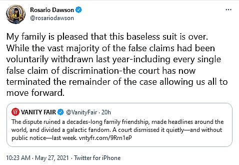 Following the first public report of the ruling by Vanity Fair on May 27th, Dawson took to her personal Twitter account to address the conclusion of the arduous saga, telling her followers, “My family is pleased that this baseless suit is over.”