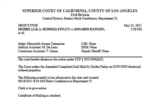 However, after Finley failed to produce the requested information after several orders from the court, Judge Armen Tamzarian ultimately ruled on May 21st that the Los Angeles Superior Court “hereby dismisses the action.”