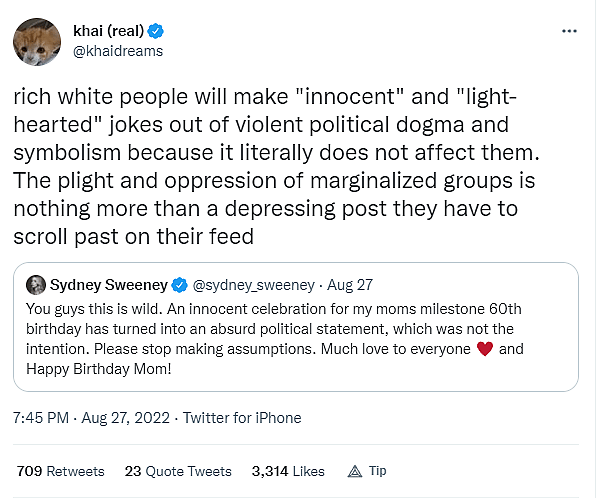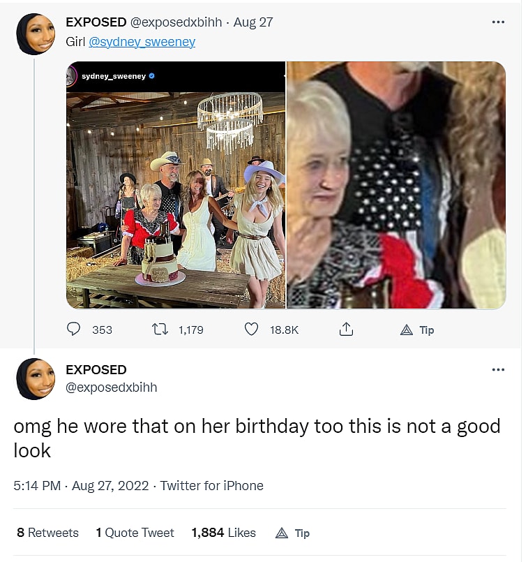 Twitter user ierickcordova tweeted, “Lol not Syndey Sweeney hanging out with her blue lives matter, maga hat wearing family. Everyone claims to be progressive & allies but go home to their raggedy racist families with the excuse ‘they’re still family’.