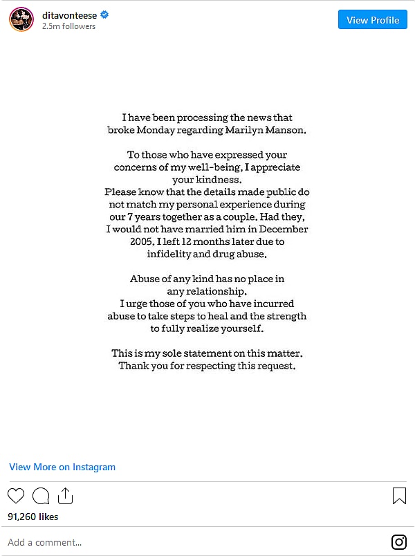 Burlesque star Dita Von Teese, who was married to Manson from 2005 to 2007, wrote on Instagram that she had ” been processing the news that broke Monday regarding Marilyn Manson”, thanking her supporters for their “concerns of my well-being” and stating “Please know that the details made public do not match my personal experience during our 7 years together as a couple.”