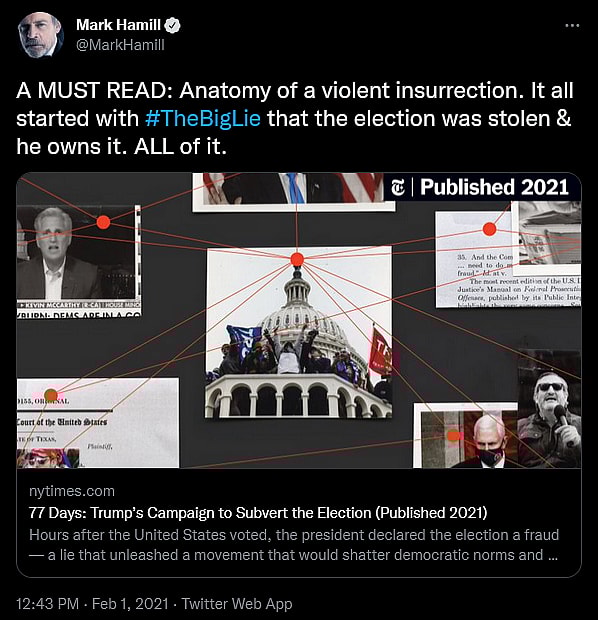 In February 2021, Hamill encouraged his readers to read a piece from the New York Times which purported to track “Trump’s Campaign to Subvert the Election”, asserting, “A MUST READ: Anatomy of a violent insurrection.”