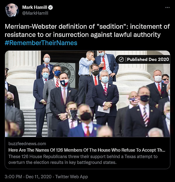 In December 2020, the actor shared an article from Buzzfeed headlined “Here Are The Names Of 126 Members Of The House Who Refuse To Accept That Biden Won,” and wrote, “Merriam-Webster definition of ‘sedition’: incitement of resistance to or insurrection against lawful authority #RememberTheirNames.”