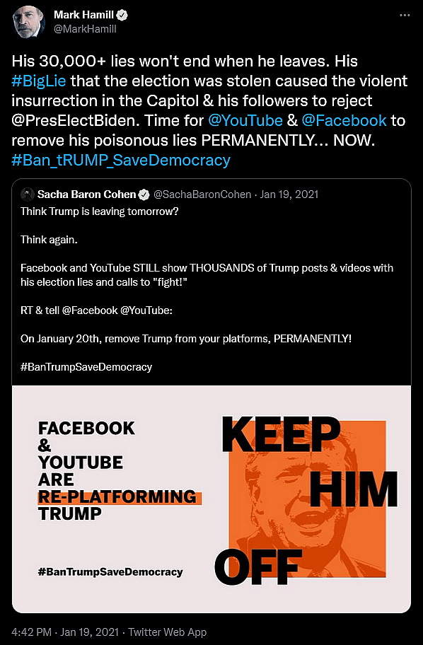 The next month, in response to Borat star Sacha Baron Cohen’s call to “remove Trump” from Facebook and YouTube, Hamill opined, “His 30,000+ lies won’t end when he leaves.”
