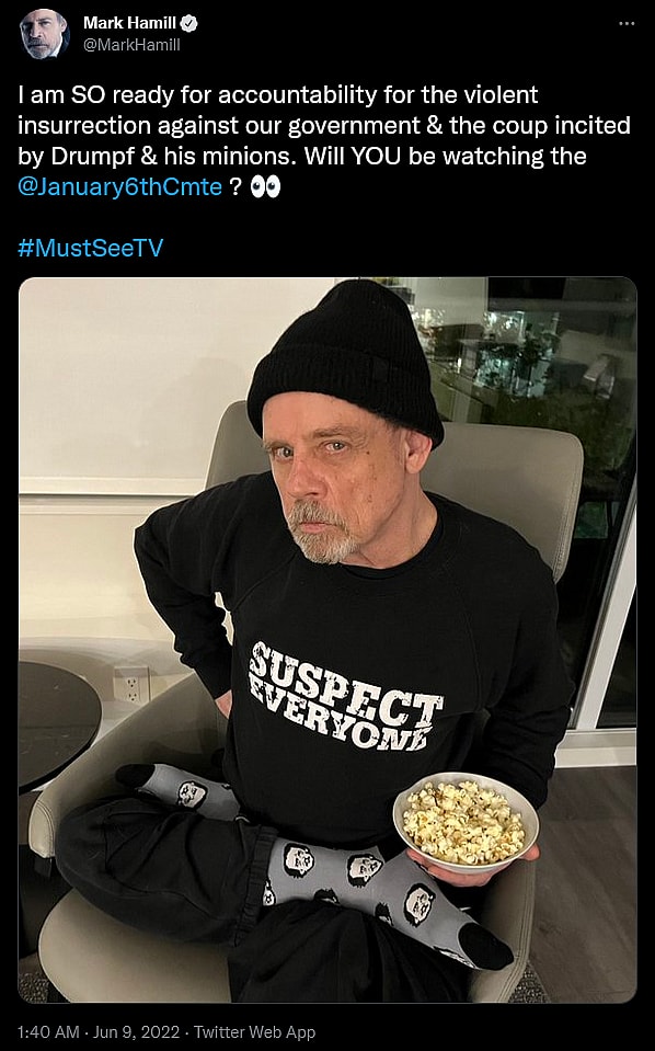 “I am SO ready for accountability for the violent insurrection against our government & the coup incited by Drumpf & his minions,” accused Hamill. “Will YOU be watching the @January6thCmte?”