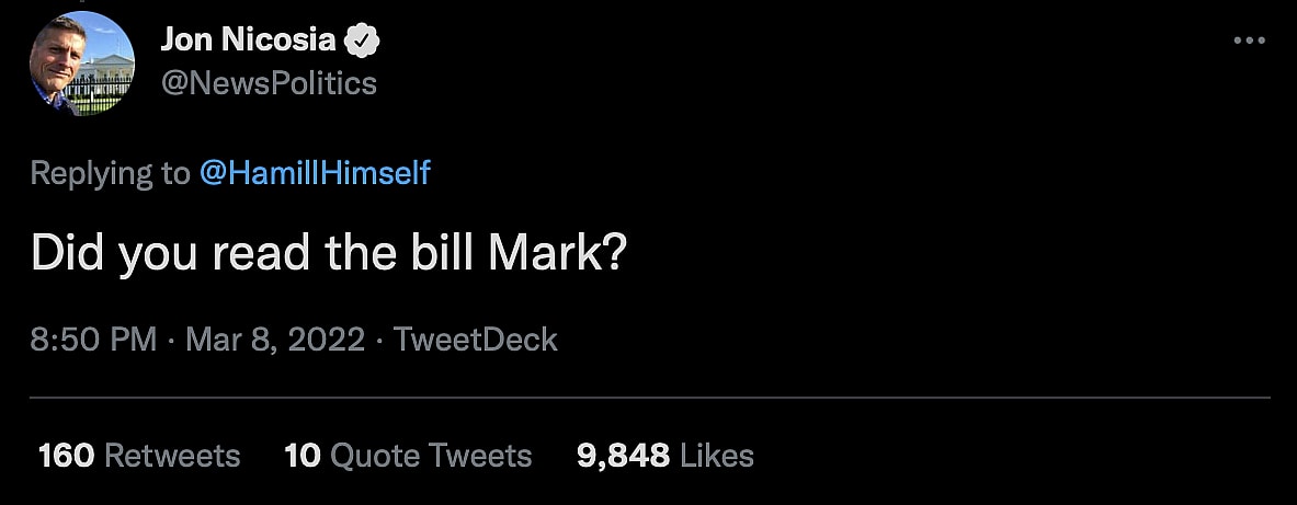 President of News Cycle Media, Jon Nicosia, also called out Hamill’s seemingly uneducated tweet, asking, “Did you read the bill Mark?”