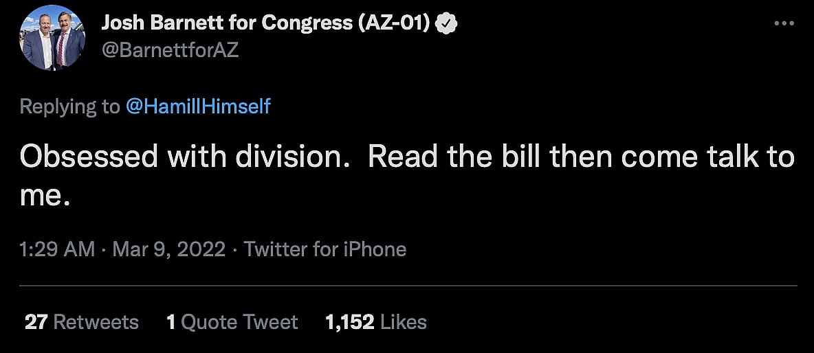 Josh Barnett, Republican candidate for the election to represent Arizona’s 7th Congressional District, tweeted to Hamill, “Obsessed with division. Read the bill then come talk to me.”