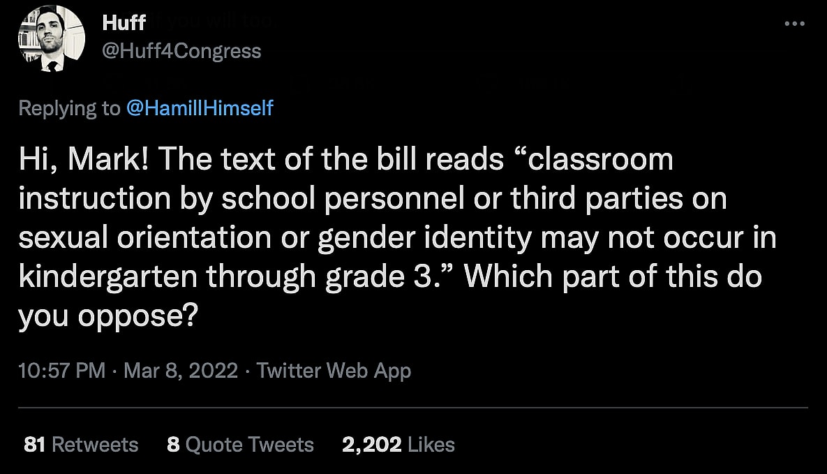 “Hi, Mark! The text of the bill reads ‘ classroom instruction by school personnel or third parties on sexual orientation or gender identity may not occur in kindergarten through grade 3.'”