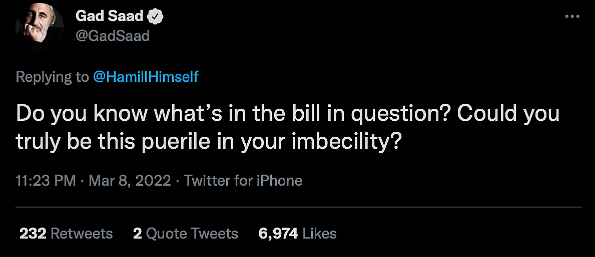 “Do you know what’s in the bill in question? Could you truly be this puerile in your imbecility?” Saad questioned Hamill.