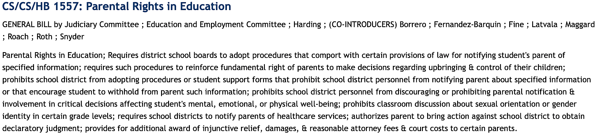 On Tuesday, the Florida senate passed HB 1557 ( Parents Rights in Education) bill that seeks to ban discussions of sexual orientation or gender identity from “kindergarten through grade 3 or in a manner that is not age-appropriate or developmentally appropriate for students in accordance with state standards.”
