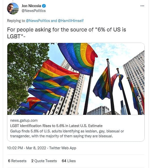 Before woke activists called him out, Nicosia shared an article from Gallup for those asking him where he got the data to back up his claim that only 6% of the population in the United States identifies as LGBT.
