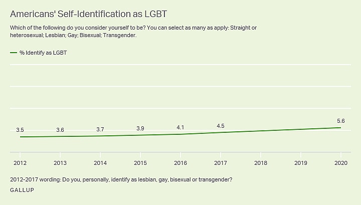 According to the study conducted by Gallup’s Jeffrey Jones, who interviewed 15,000 individuals throughout 2020, a total of 5.6% of the population in the United States identifies as either lesbian, gay, bisexual, or transgender.