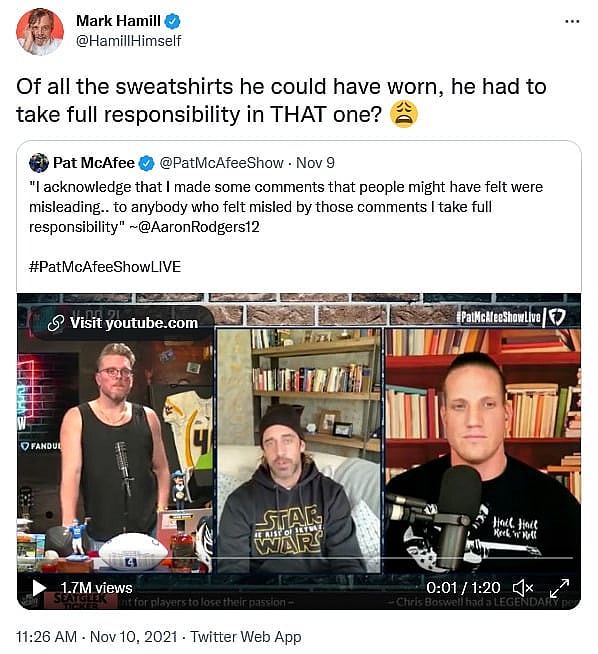 It is during this appearance, as seen above, that Rodgers wore the aforementioned Star Wars sweatshirt – much to the apparent chagrin of Hamill.