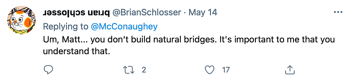 @BrianSchlosser didn’t fixate on the mask, but he did call out another absurdity found in the actor’s tweet, stating ,”Um, Matt… you don’t build natural bridges. It’s important to me that you understand that.”