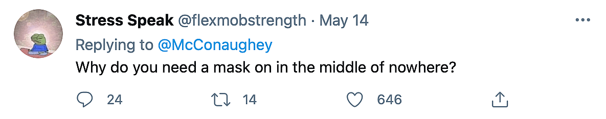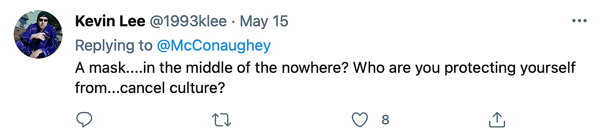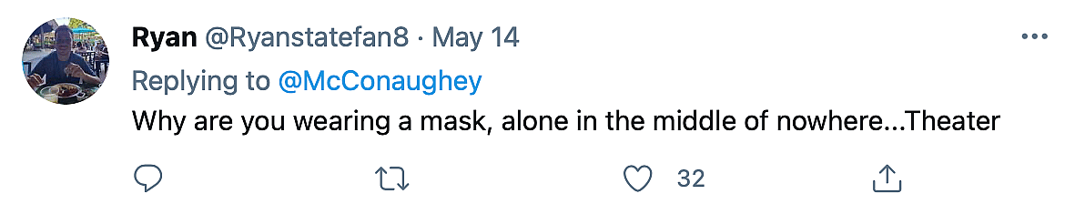 “Pretty sure you’re safe to take your mask off bud,” reads a comment by another user, @petelehrman, who similarly wondered what reason McConaughey had to wear a mask when he’s alone outdoors.
