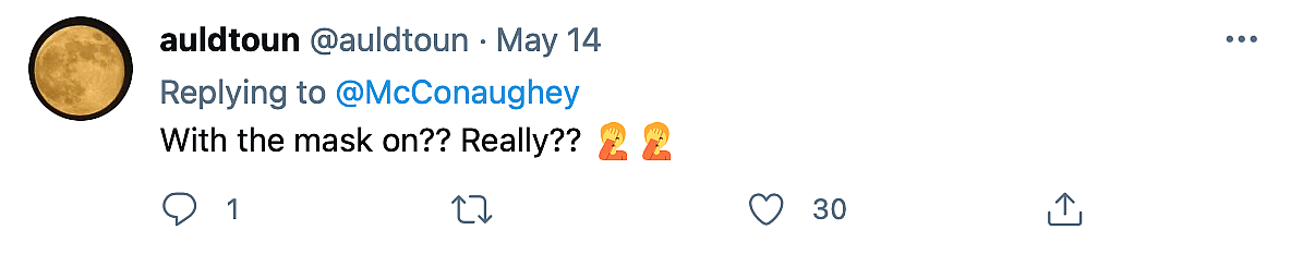 “With the mask on?? Really??” questioned @auldtoun, who also added a much needed facelpalm emoji. Twice.