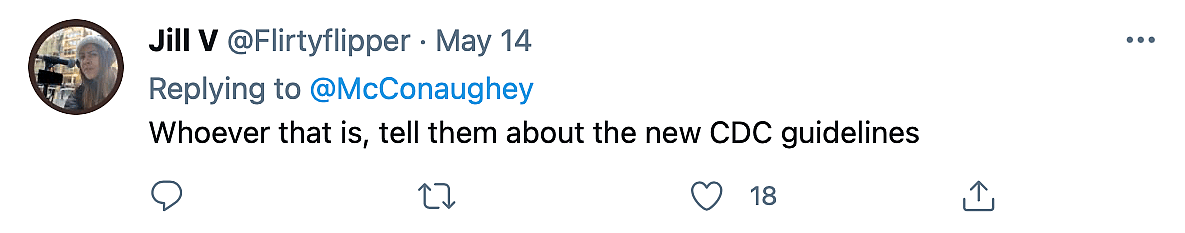 “Whoever that is, tell them about the new CDC guidelines,” read a somewhat sarcastic comment by @Flirtyflipper which pointed out that McConaughey’s face isn’t even visible from under his sunglasses, face mask, and bandana.