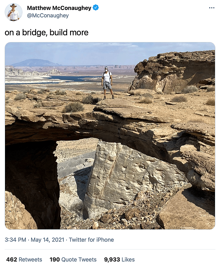 What McConaughey probably didn’t anticipate, however, was the storm of roast tweets that would follow his posting of the trek photo, many of which are very much worth taking a look.
