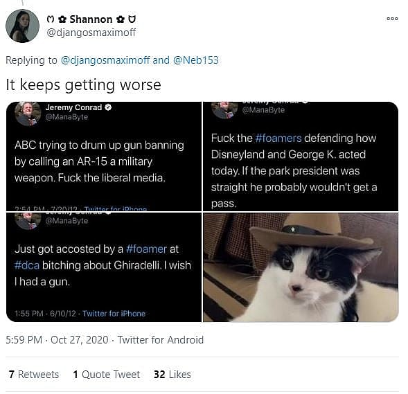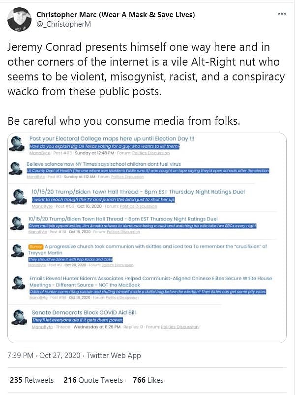 Twitter user @_ChristopherM also attacked Conrad and described him as a “vile Alt-Right nut who seems to be violent, misogynist, racist, and a conspiracy wacko.”