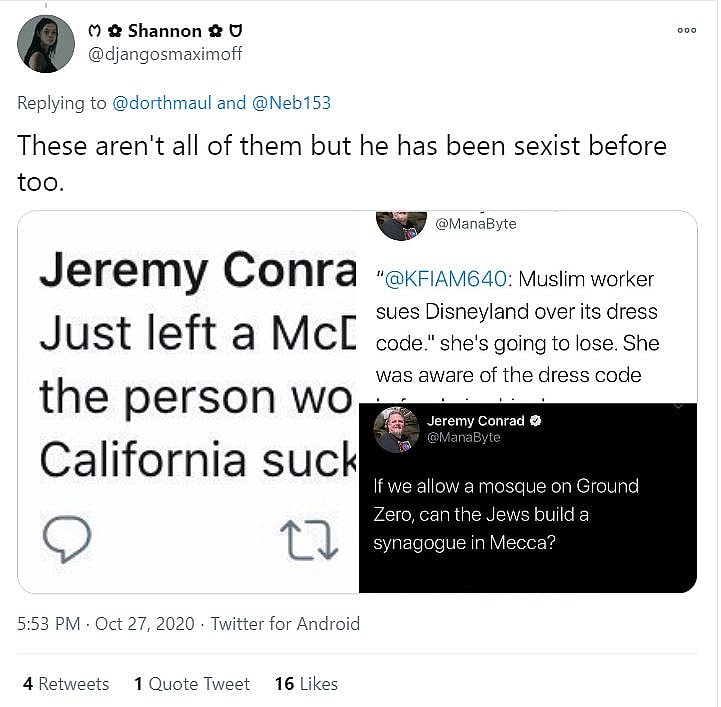 Another user @djangosmaximoff would attack Conrad as a racist and a sexist.