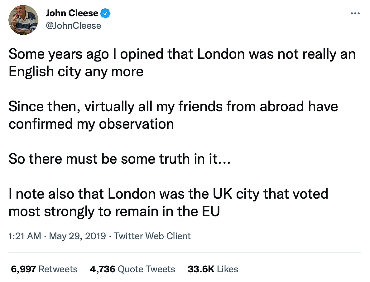 “Some years ago I opined that London was not really an English city any more,” wrote the actor on Twitter in 2019. “Since then, virtually all my friends from abroad have confirmed my observation. So there must be some truth in [my statement].”