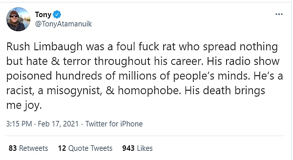 What We Do In The Shadows actor Anthony Atamanuik wrote, “Rush Limbaugh was a foul f*** rat who spread nothing but hate & terror throughout his career. His radio show poisoned hundreds of millions of people’s minds. He’s a racist, misogynist, & homophobe. His death brings me joy.”