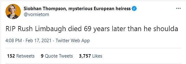 Rick and Morty writer and College Humor host Siobhan Thompson wrote, “RIP Rush Limbaugh died 69 years later than he shoulda.”